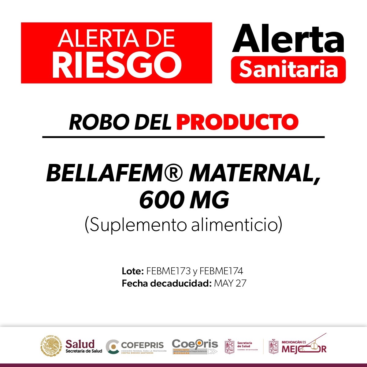 Morelia, Michoacán, 27 de enero de 2026.-* La Comisión Federal para la Protección contra Riesgos Sanitarios (Cofepris), a través de la Secretaría de Salud de Michoacán (SSM), informa a la población sobre la alerta sanitaria emitida por el robo del producto Bellafem®️ maternal, suplemento alimenticio de 600 mg, lo que representa un riesgo potencial para la salud.